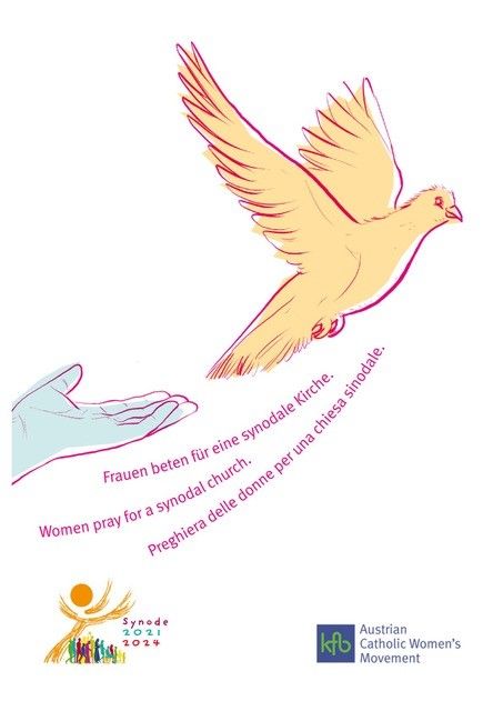 Die Gebetspostkarte ist eine Beteiligung der kfbö an der aktuellen Weltsynode. Die von Papst Franziskus ausgerufene Weltsynode 2021-2024 befindet sich seit diesem Herbst in ihrer dritten Phase, in der im Vatikan alle mitgeteilten Meinungen zu Gemeinschaft, Teilhabe und Sendung unserer Kirche besprochen werden. Vom 4.-29- Oktober tagt darüber die Weltbischofssynode. Damit letztere fruchtbare Ergebnisse hervorbringt und vor allem auch die Stimmen von uns Frauen Gehör finden, wollen wir sie mit unseren persönlichen Gebeten unterstützen. Unter dem Motto „Frauen beten für eine synodale Kirche“ zeigt die Postkarte eine offene Hand und aussendende Taube für eine Botschaft im Sinne des Heiligen Geistes.